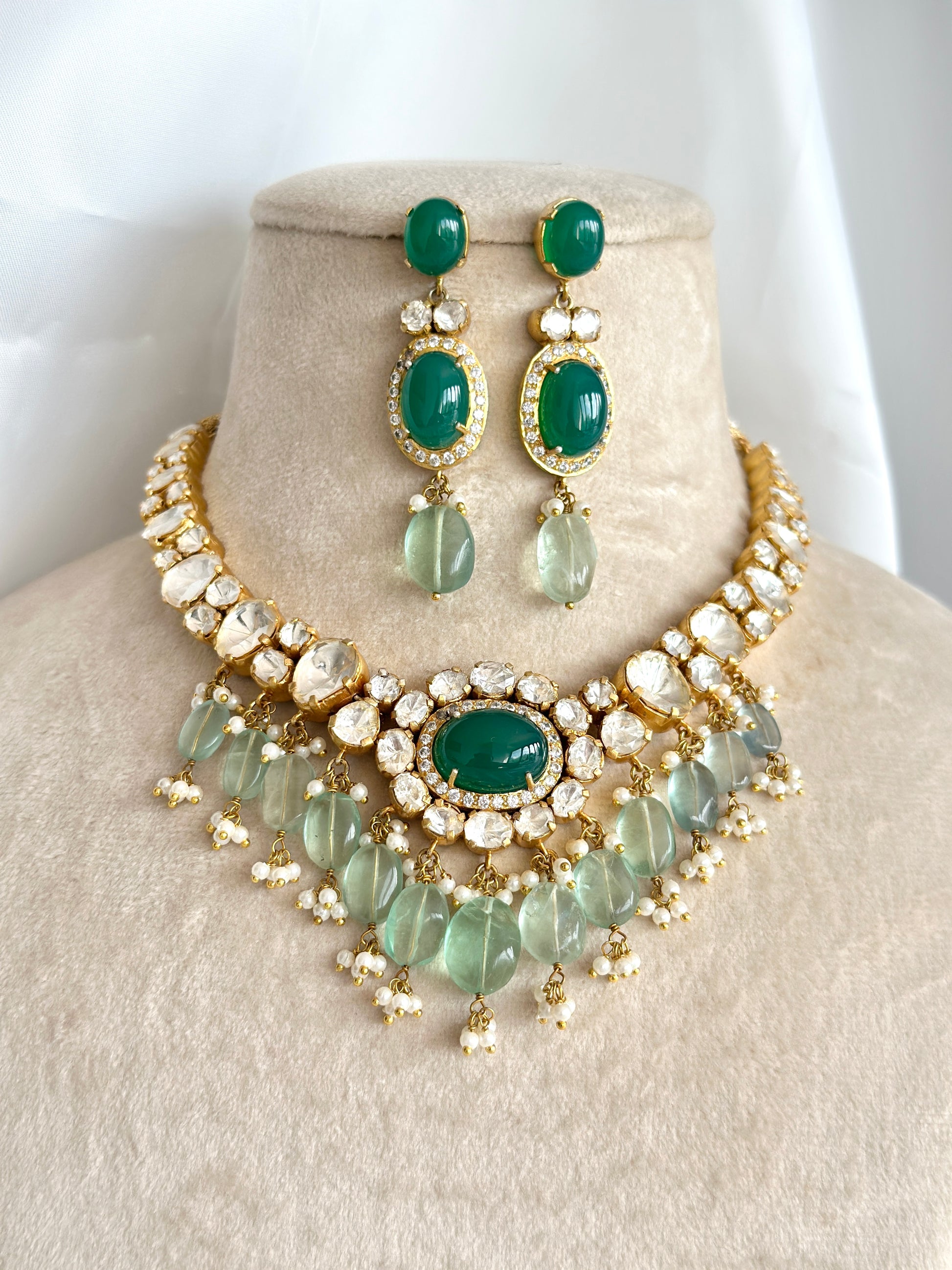 Handcrafted in a 92.5 silver, the necklace is set in semi precious polki with green fluorites beaded all over.