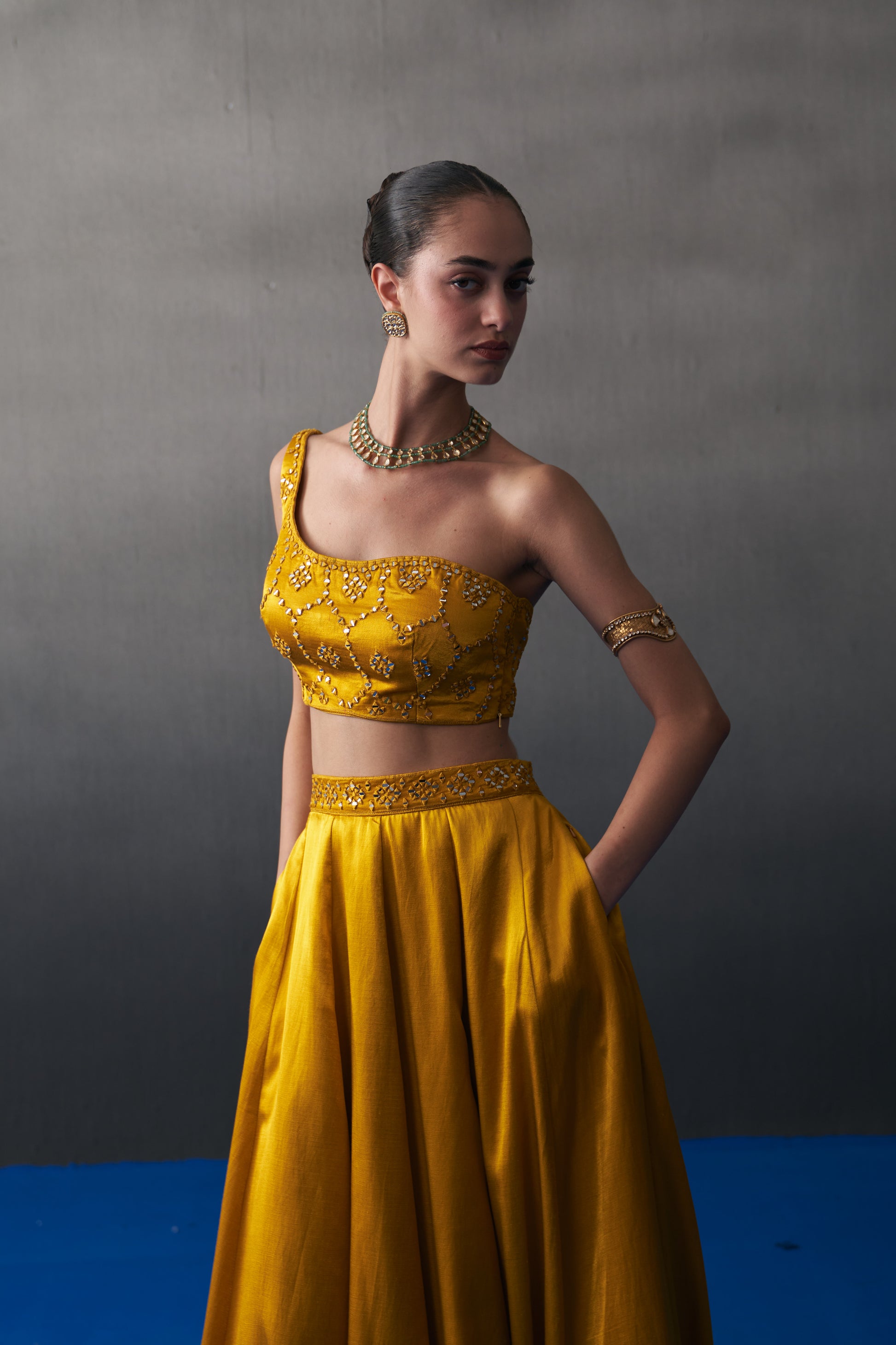 Handcrafted in a 92.5 silver, the necklace is set in semi precious polki with green beads. It also has an adjustable string at the back and the length can be altered.