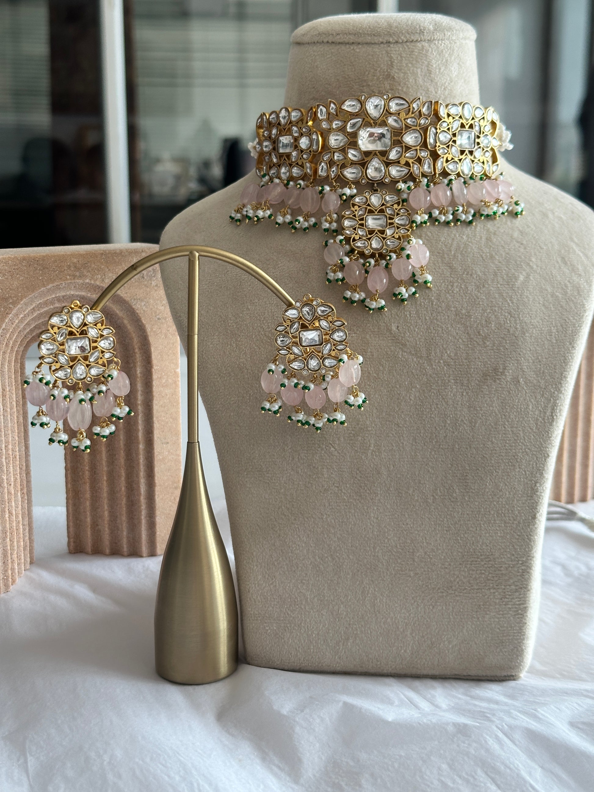 Handcrafted in a 92.5 silver, the necklace is set in semi precious polki with pink onyx gemstones. The necklace has an adjustable dora at the back and comes with a pair of earrings.