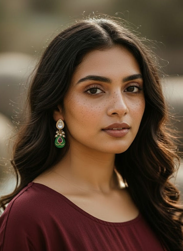 Handcrafted in 92.5 silver these earrings are 22kt gold plated with Semi Precious Polki and gemstone setting.