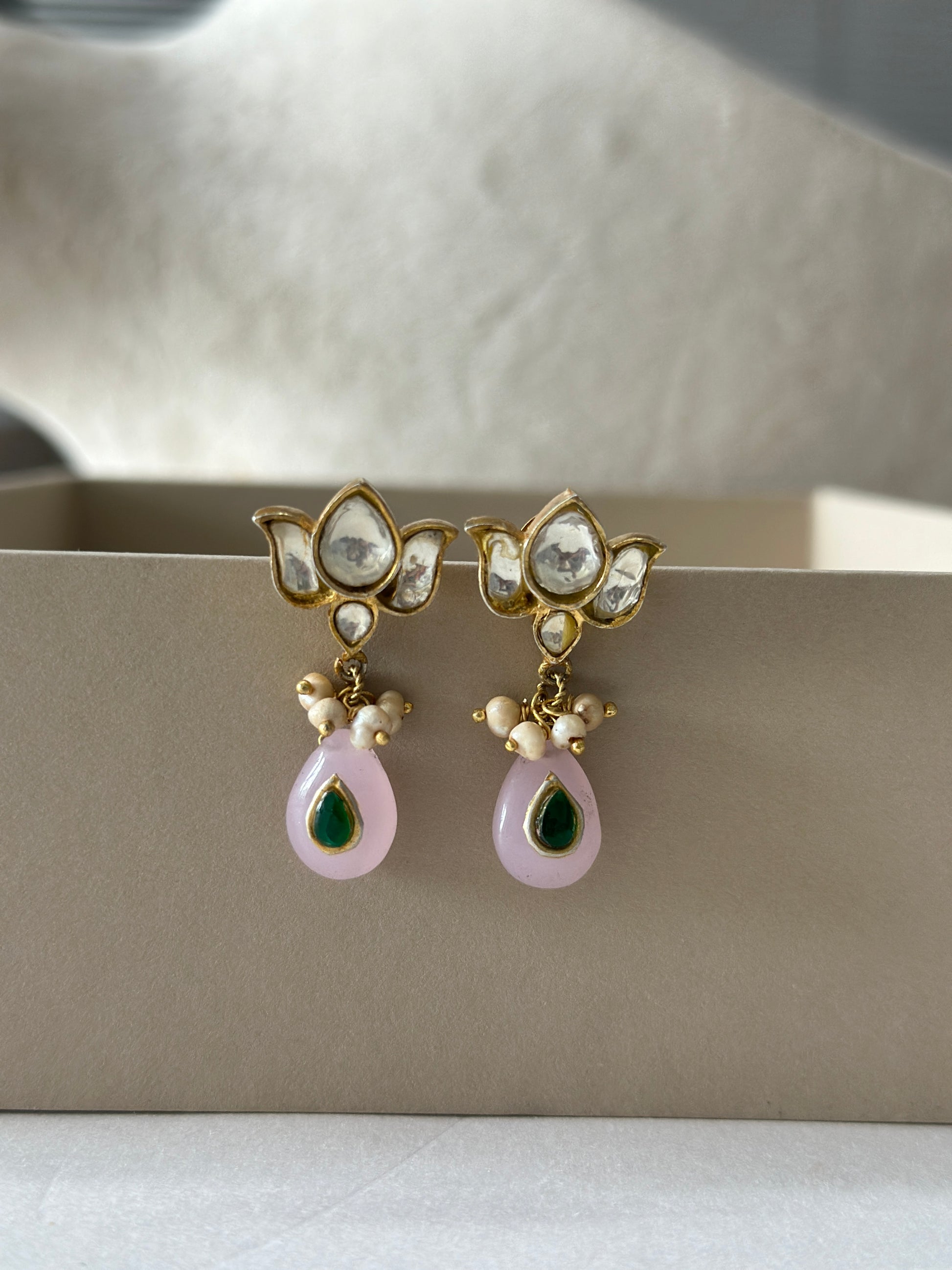 Handcrafted in 92.5 silver these earrings are 22kt gold plated with Semi Precious Polki and gemstone setting.