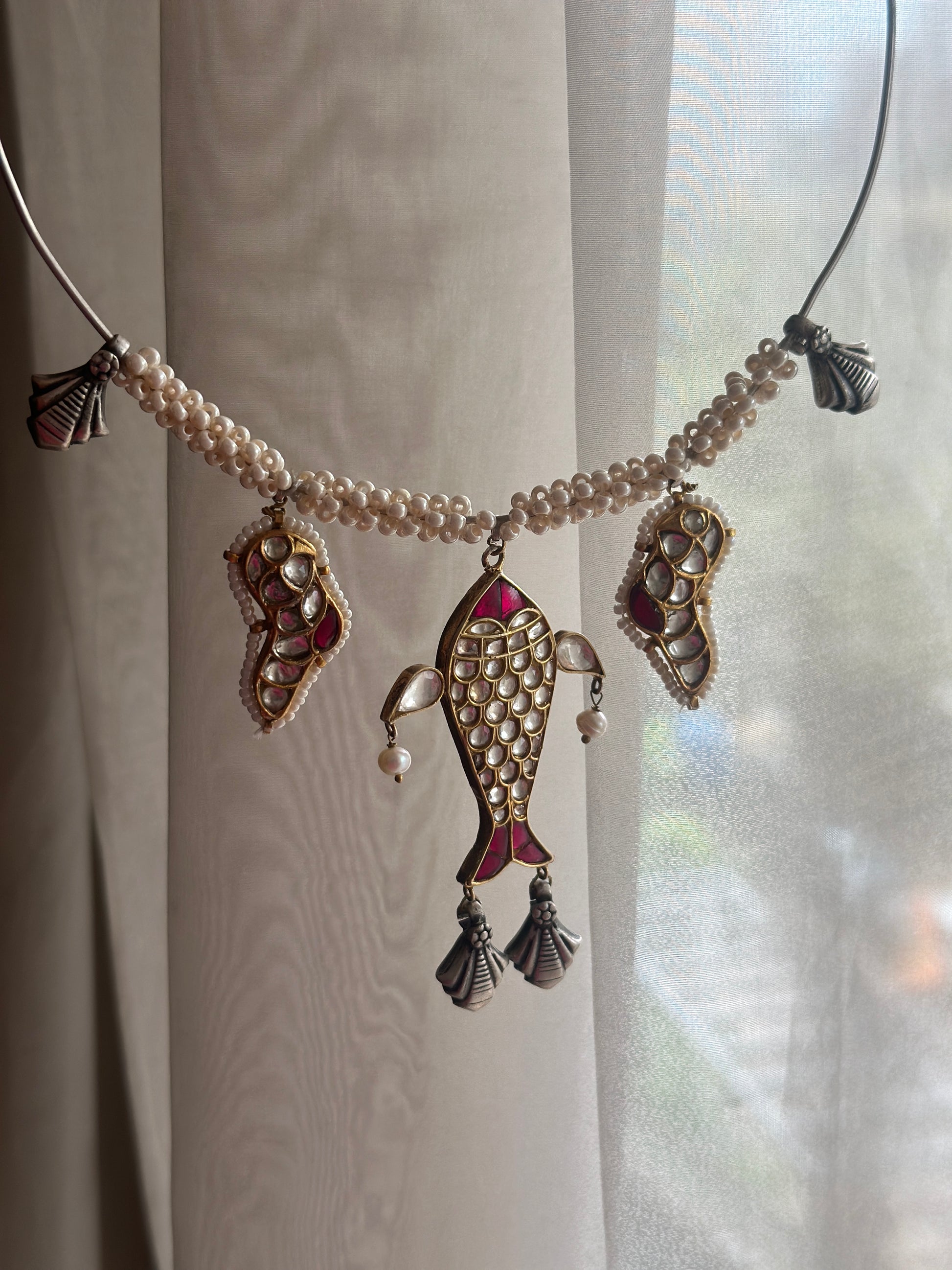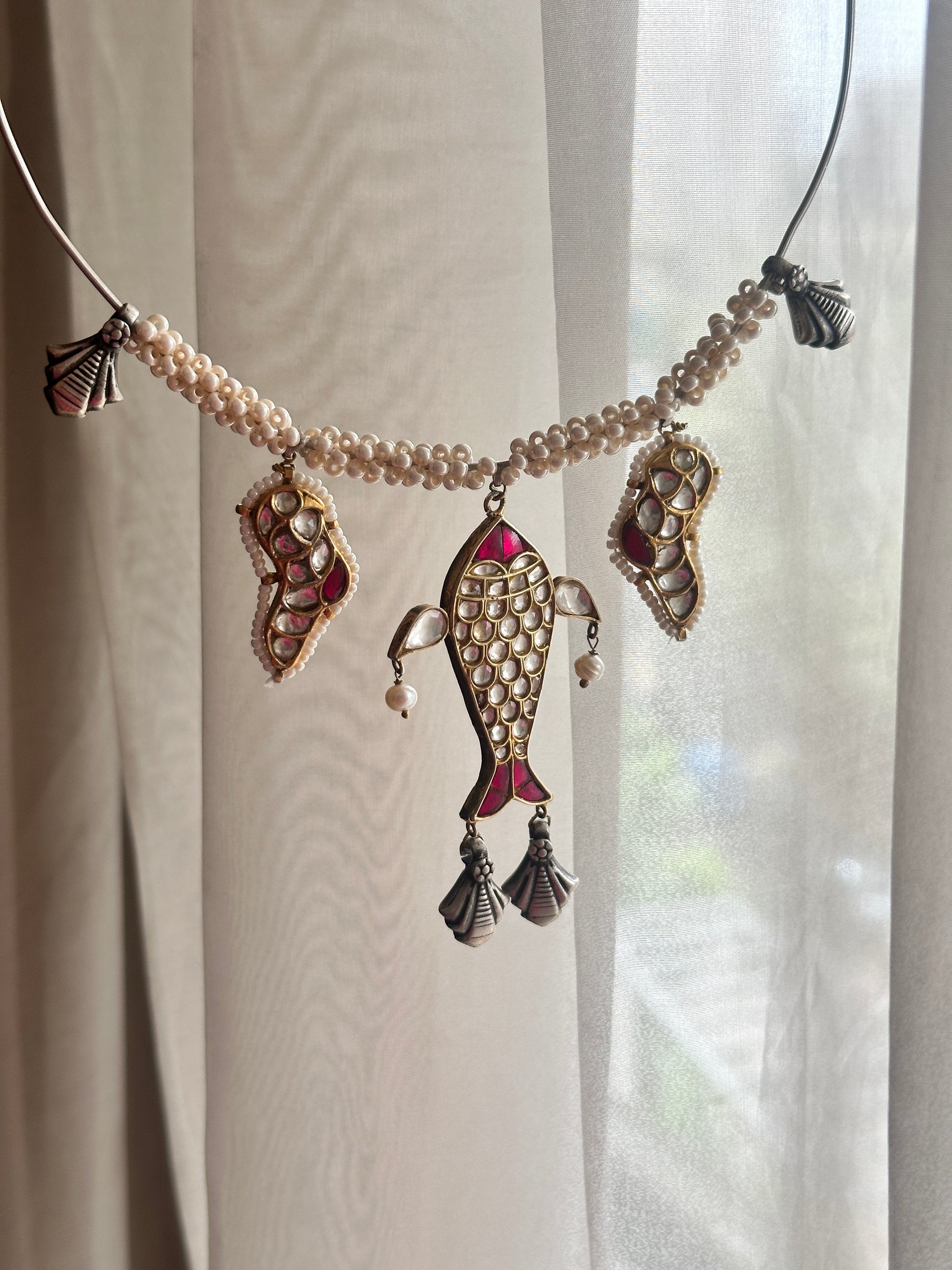 Handcrafted in 92.5 silver the Matsaya hasli is finished in 22kt gold plating with semi precious Polki and Gemstone setting.